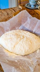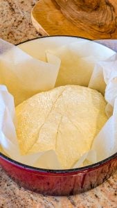 - Once the dough has risen, turn it out onto a lightly floured surface. With floured hands, gently shape it into a ball. Let it rest for 30 minutes while you preheat the oven.