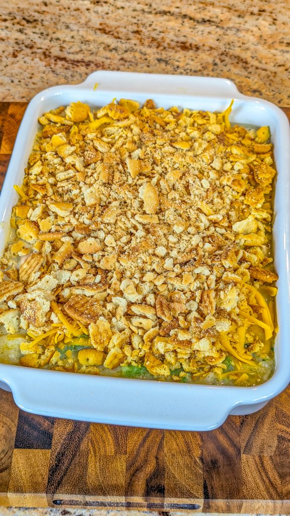 - Combine the melted butter with the crackers and sprinkle this over the casserole.