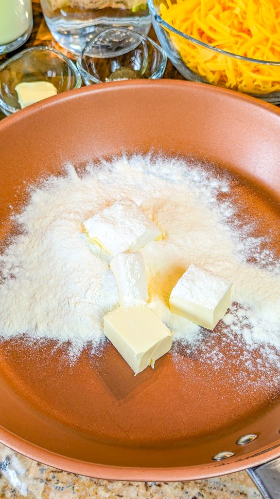 - Combine the 4 tablespoons of melted butter with the flour in a pan and cook for 2 or 3 minutes, whisking all the time.