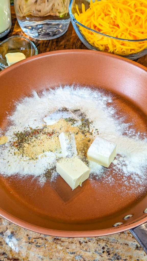 Add the onion powder, red pepper, thyme and marjoram, and then gradually whisk in the milk and broth, alternating between them.