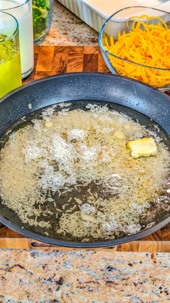 - Add the water, salt, rice, and remaining unsalted butter to a pan and heat until boiling, then cover and simmer for 12 to 15 minutes, or until there’s no water left in the pan.