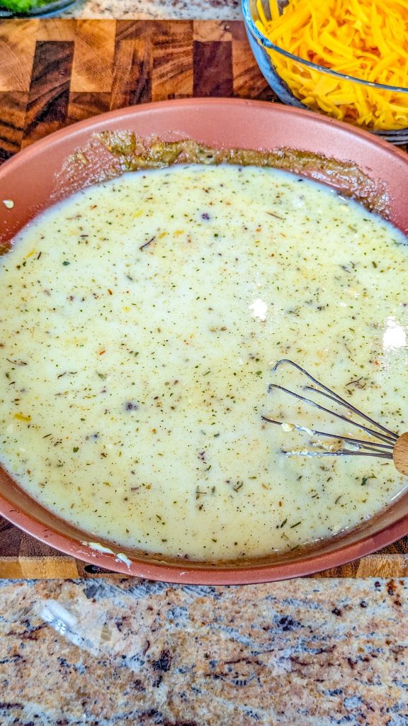 - Add the onion powder, red pepper, thyme and marjoram, and then gradually whisk in the milk and broth, alternating between them.
