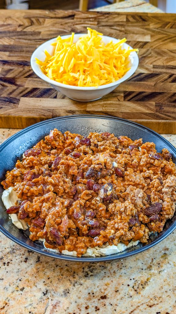 Pour the Chili over the Cream Cheese and spread evenly