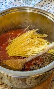 1. Break the spaghetti noodles in half. Lay them over the beef mixture in the Instant Pot, a few at a time. Rotate the noodles slightly as you layer them to prevent sticking.