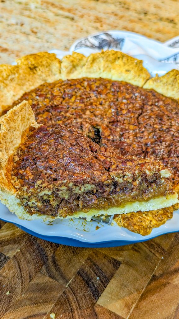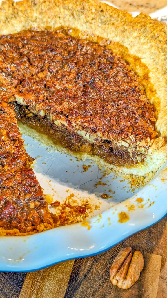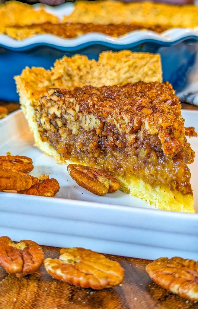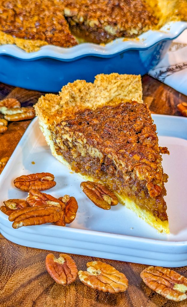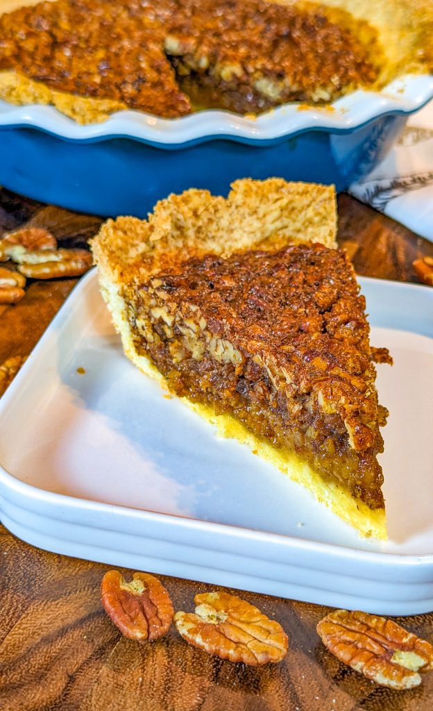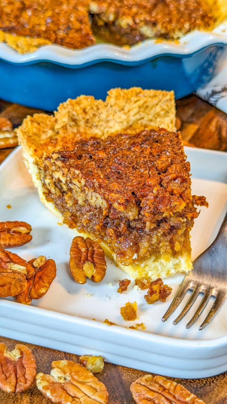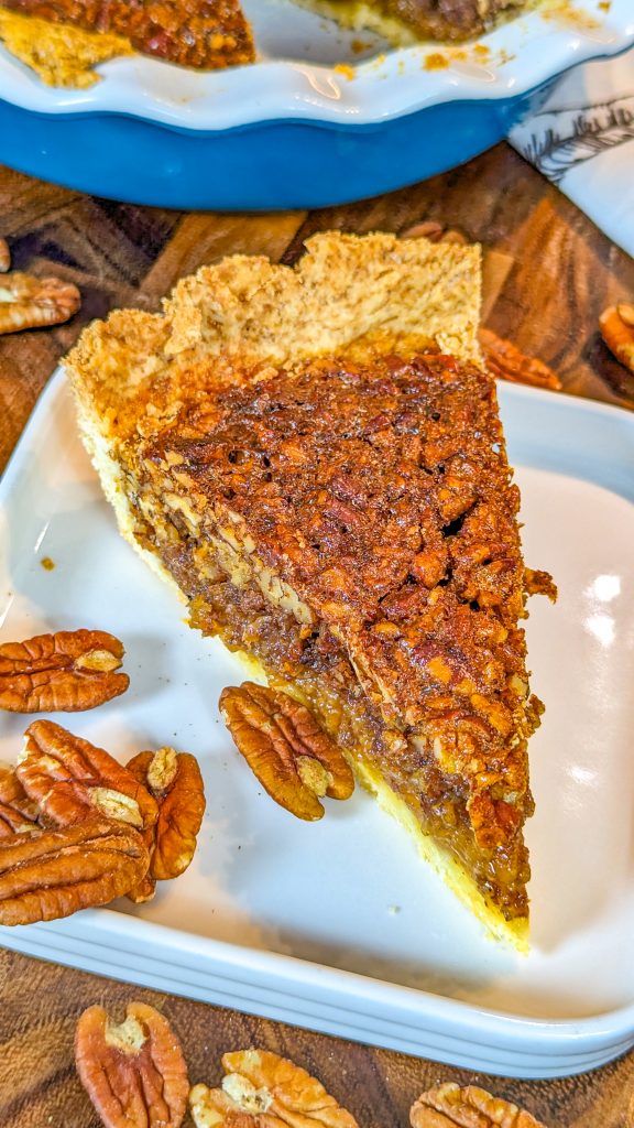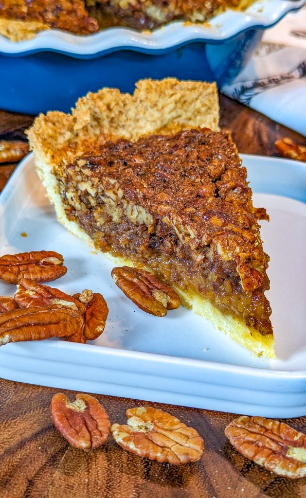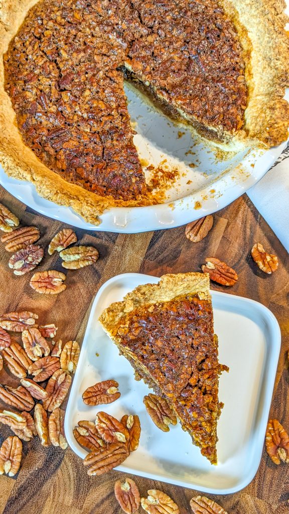 This delicious pecan pie combines a crumbly pie crust with a sweet, rich custard layer and crunchy pecans, for a dessert that’s great for the holidays.