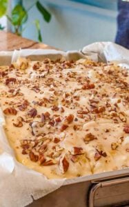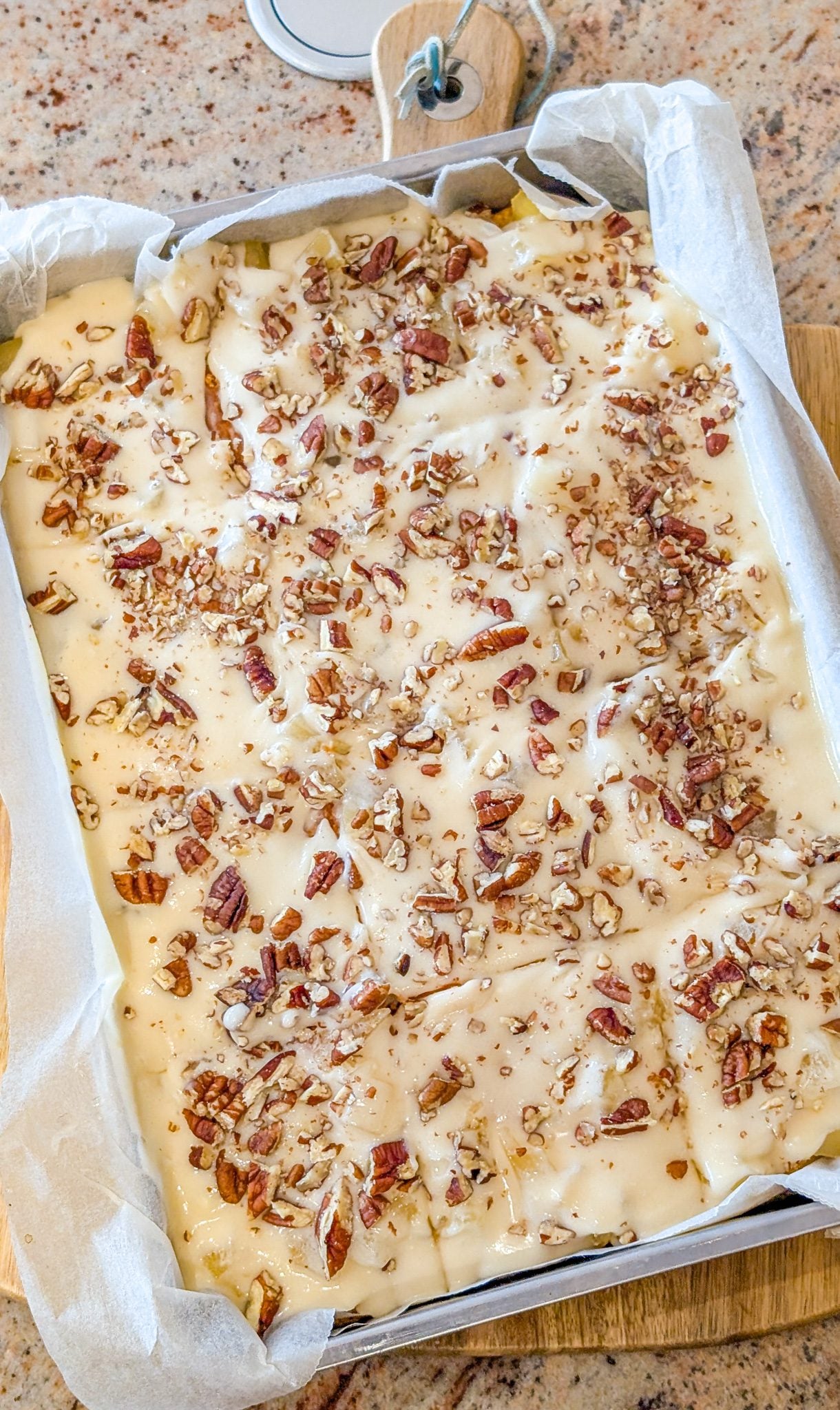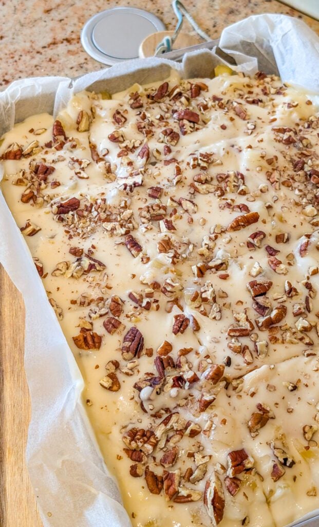 - Stir in the vanilla extract and crushed pecans until evenly combined.