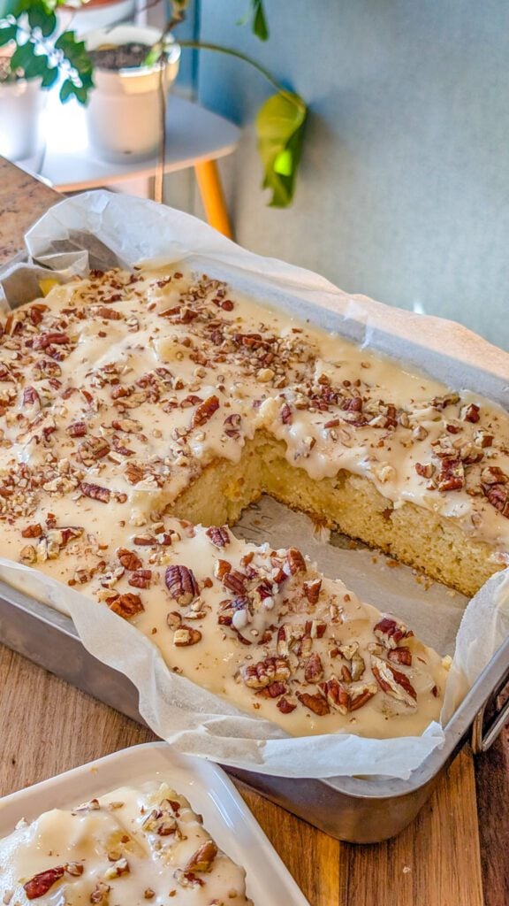 Store the cake in an airtight container in the refrigerator for up to 4–5 days. Because of the moist topping, it’s best kept chilled. You can freeze individual slices for up to 2 months—wrap them tightly and thaw in the fridge before serving.