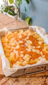 - Carefully pour the hot pineapple mixture evenly over the cake, making sure it seeps into the holes. Let the cake cool completely so the flavors can absorb.
