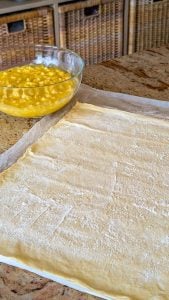 - Roll out your pie crust or puff pastry on a lightly floured surface. Cut into rectangles or circles, about 4–5 inches wide.