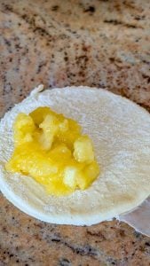 - Place a spoonful of the apple filling onto one half of each dough piece, leaving a border around the edges.