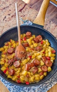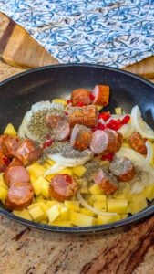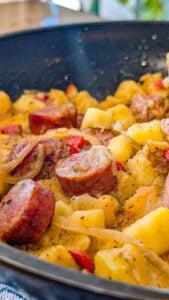 - Add the sliced smoked sausage to the skillet. Stir to combine with the potatoes and peppers.