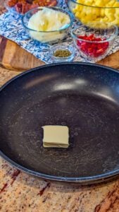 - Heat a large skillet over medium heat and add the butter. Once melted, add the diced onion and cook for 3–4 minutes until soft and translucent.