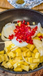 - Add the cubed potatoes, chopped bell peppers, seasoned salt, black pepper, and Italian seasoning. Stir everything together so the potatoes are well coated.