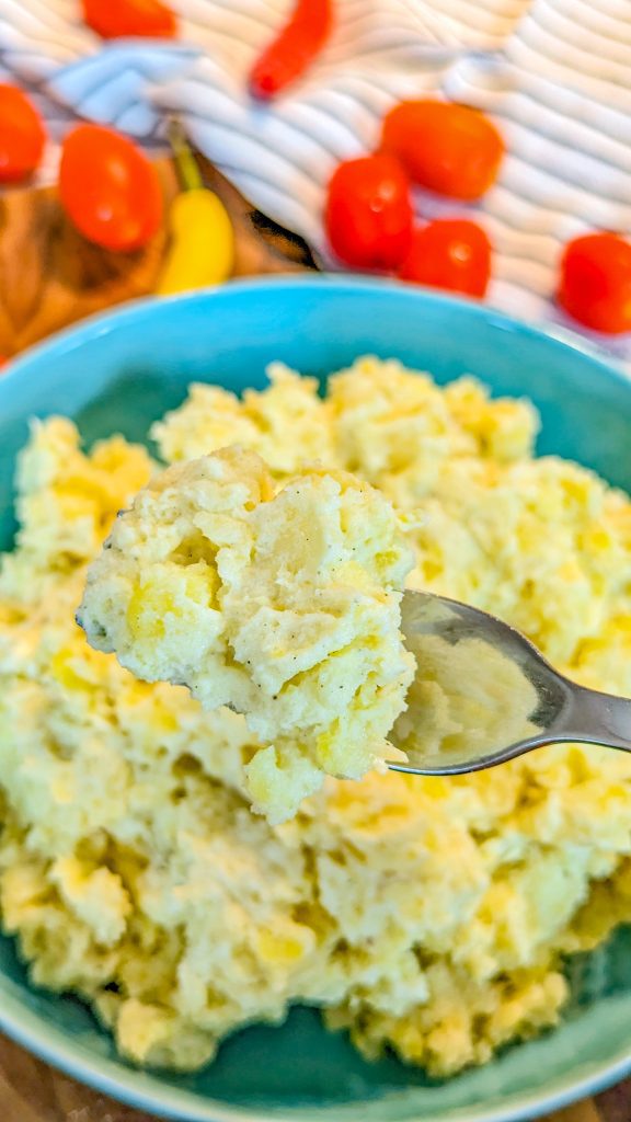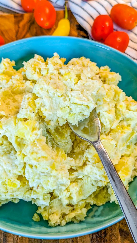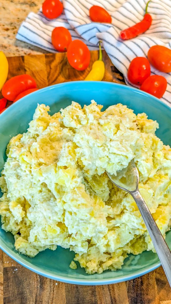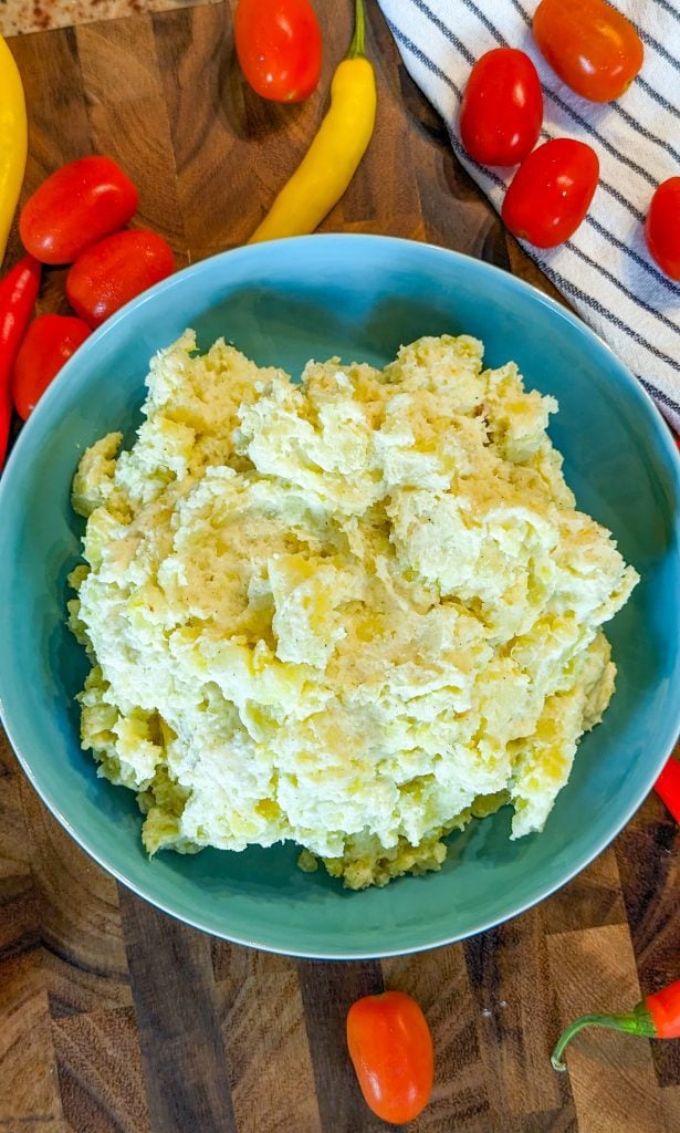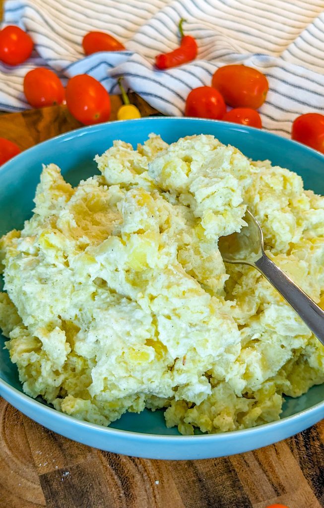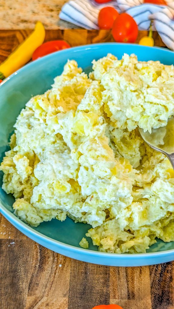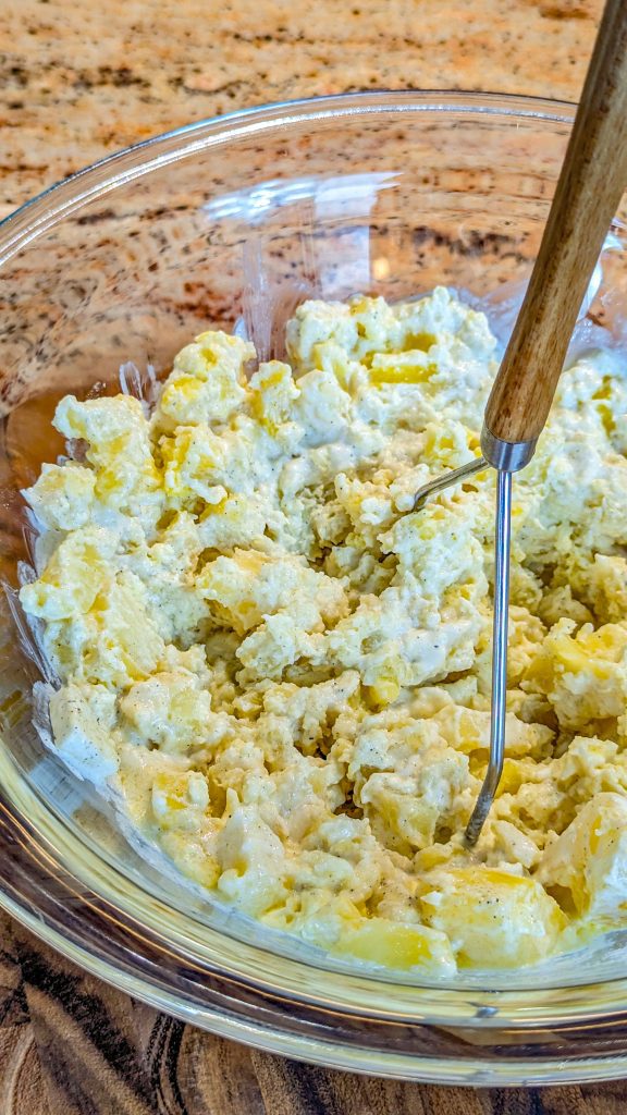 8. Mash until creamy and smooth (use a manual masher or rice, not an electric mixer) and season to taste.