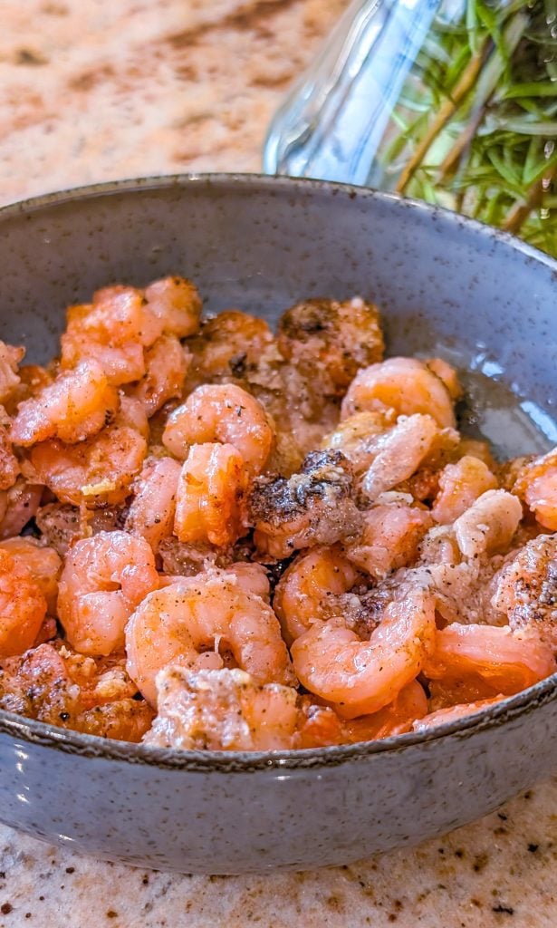 - Add the peeled and deveined shrimp to the bowl and toss thoroughly so each piece is evenly coated with the garlic-Parmesan mixture.
