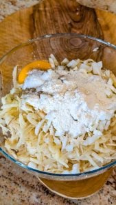 1. In a large mixing bowl, combine the grated potatoes and chopped onion. In a separate bowl, whisk the egg, then add the flour, salt, and pepper. Mix until smooth.