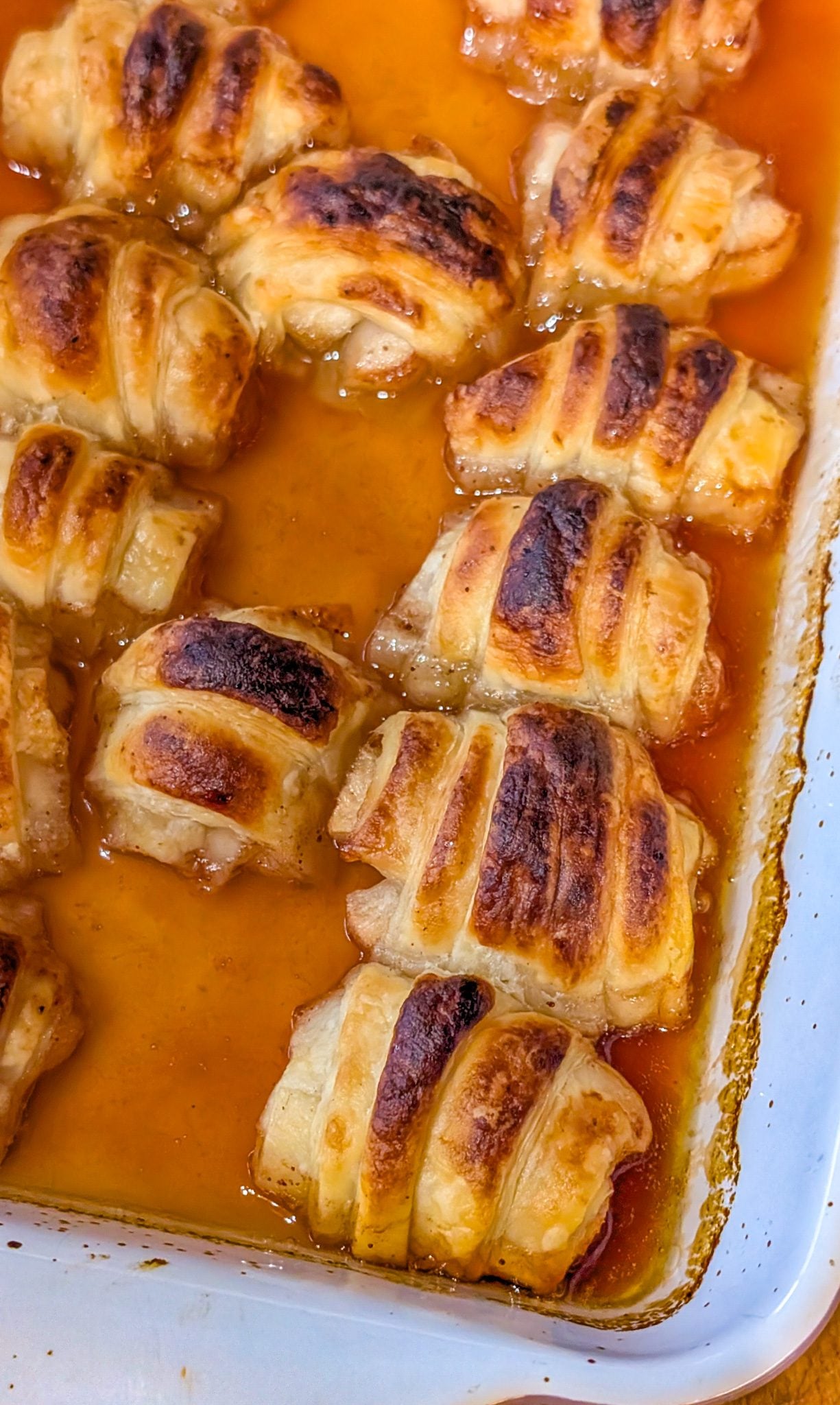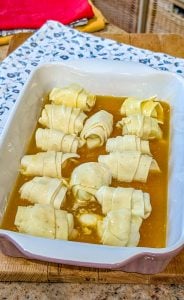 6. Pour the butter-orange sauce evenly over the apple rolls in the baking dish.