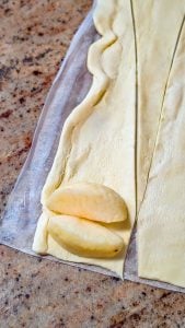 2. Unroll the crescent rolls and wrap each apple quarter with one roll, ensuring the apple is fully enclosed.