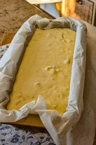 7. Pour the batter into the prepared loaf pan and smooth the top with a spatula. Sprinkle the remaining ½ cup of toasted coconut evenly over the top.