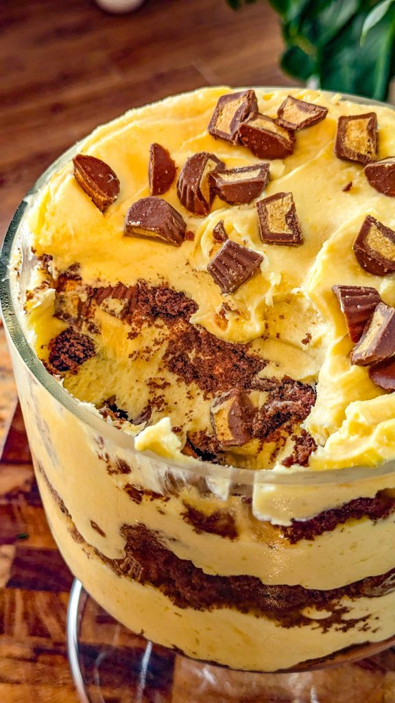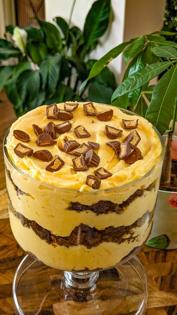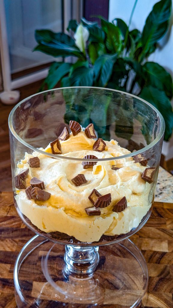 - Add ⅓ of crumbled brownies into the serving bowl. Add ⅓ peanut butter cups. Add ⅓ of the prepared pudding mix. Repeat until done with the ingredients.