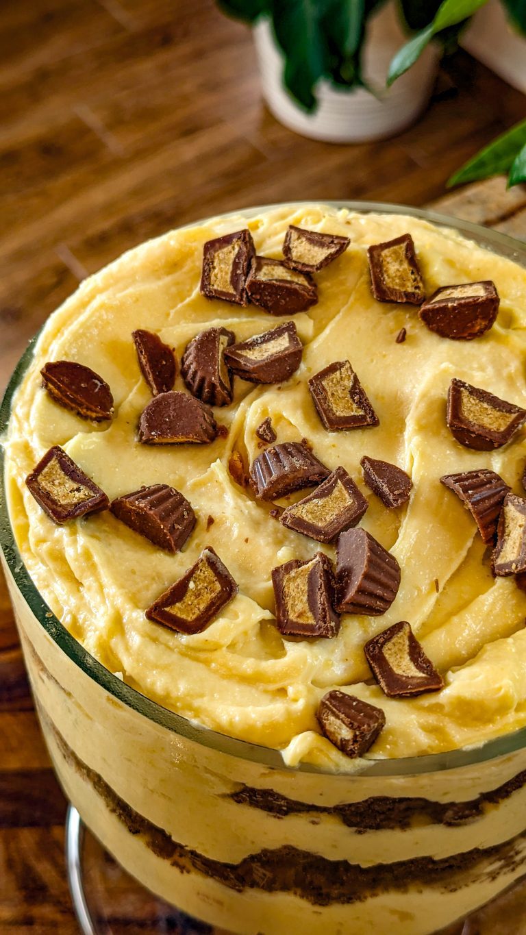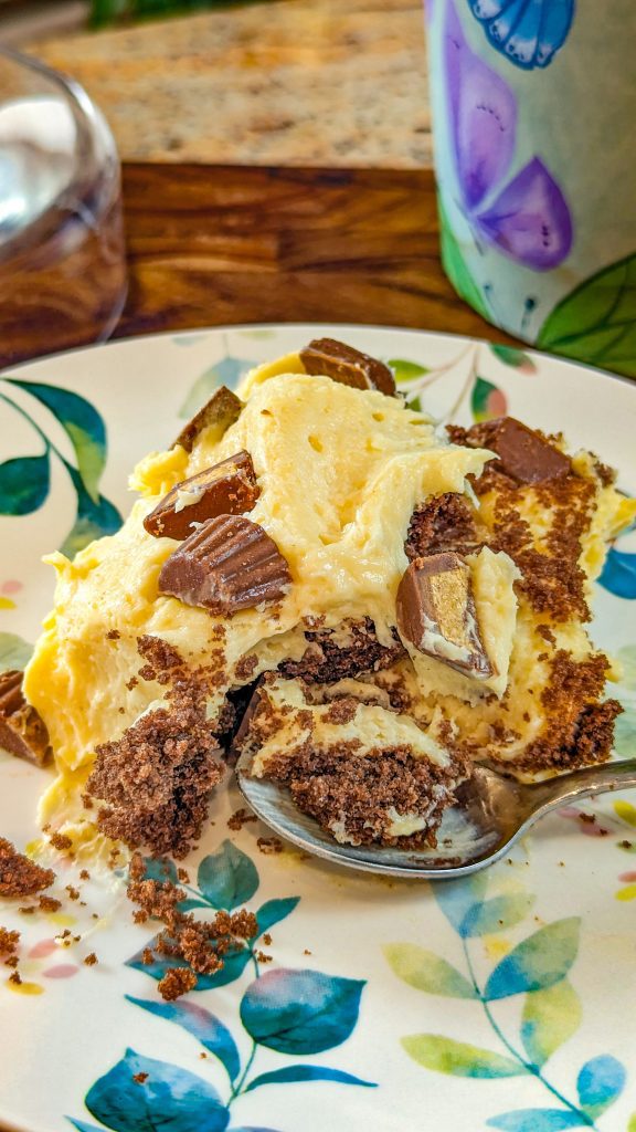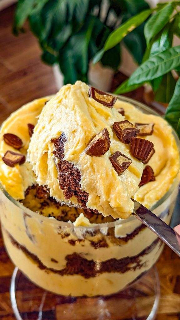 - Add the remaining whipped cream on top and garnish with the reserved ⅓ cup of peanut butter cups. Place in the fridge to chill and serve!
