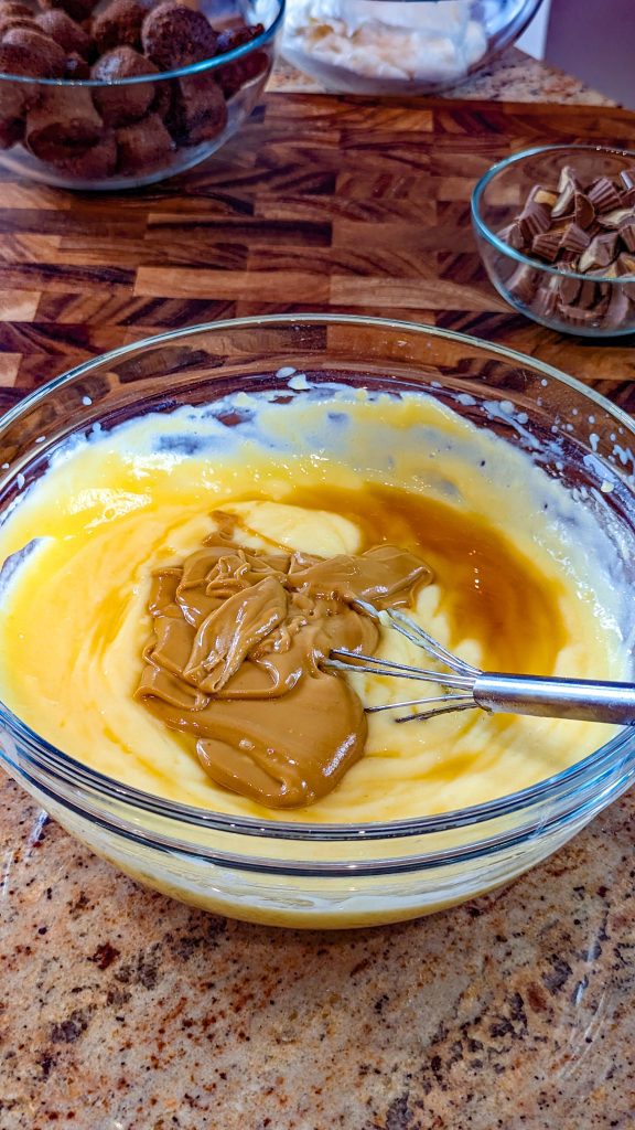 - Add pudding mix and milk into a bowl. Mix until thick and add in peanut butter and vanilla. Mix well to combine.