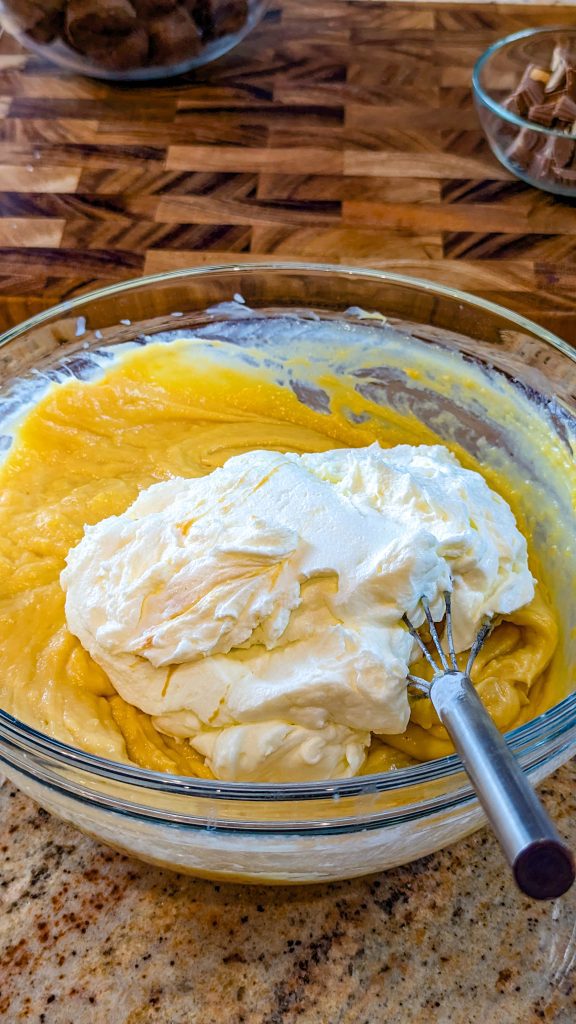 - Add 16 oz whipped cream and fold it in carefully using a spatula.