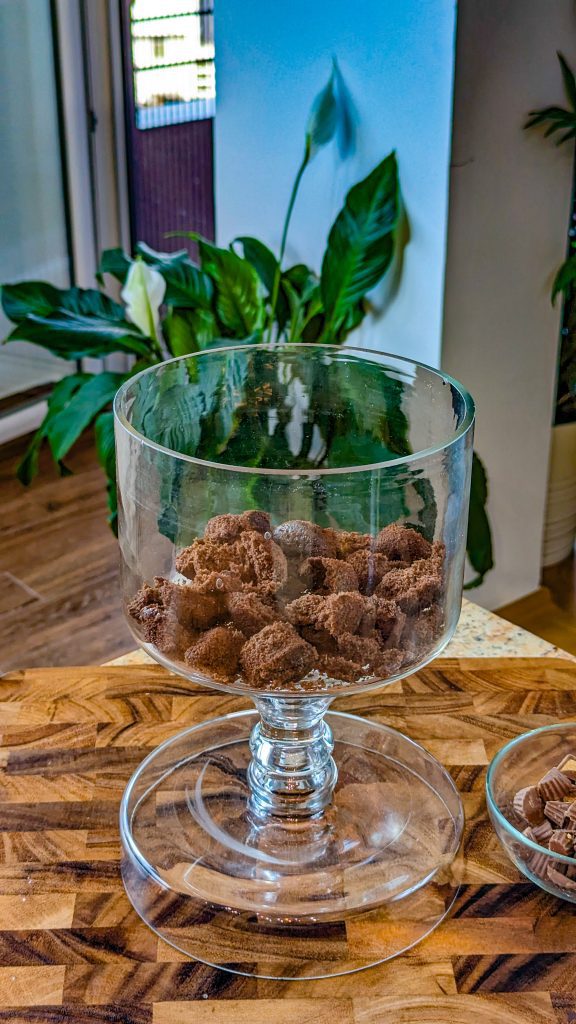 Add ⅓ of crumbled brownies into the serving bowl. Add ⅓ peanut butter cups.