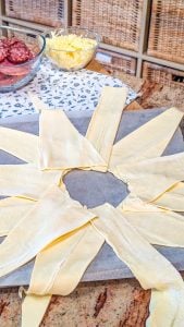 - Unroll both cans of crescent roll dough and separate into individual triangles. Arrange the triangles in a circular pattern on the pan. The wide ends should overlap at the center, forming the inner circle, and the pointed ends should fan outward like the rays of a sun.