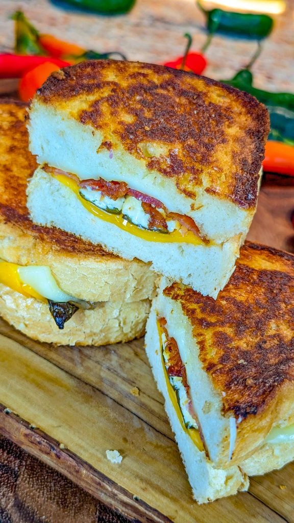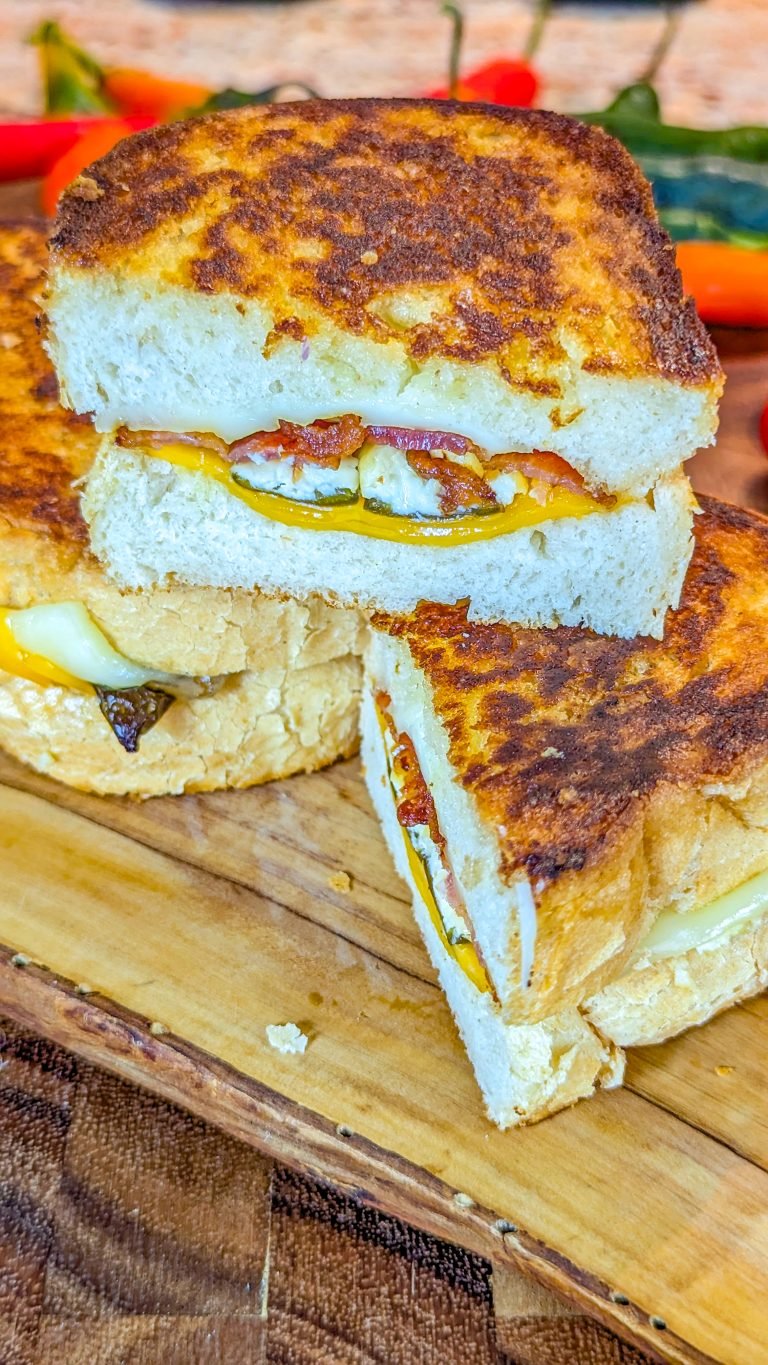 Grilled cheese is a popular comfort food and it’s great served with a bowl of rustic tomato soup. This recipe adds cream cheese stuffed jalapenos and bacon into the mix to make the most amazing grilled cheese you ever had!