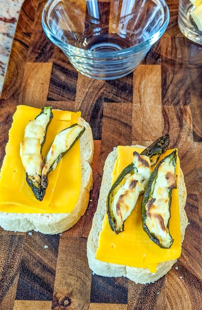 5. Slice the cooked jalapenos into bite-sized pieces and divide between the cheddar-topped bread slices.