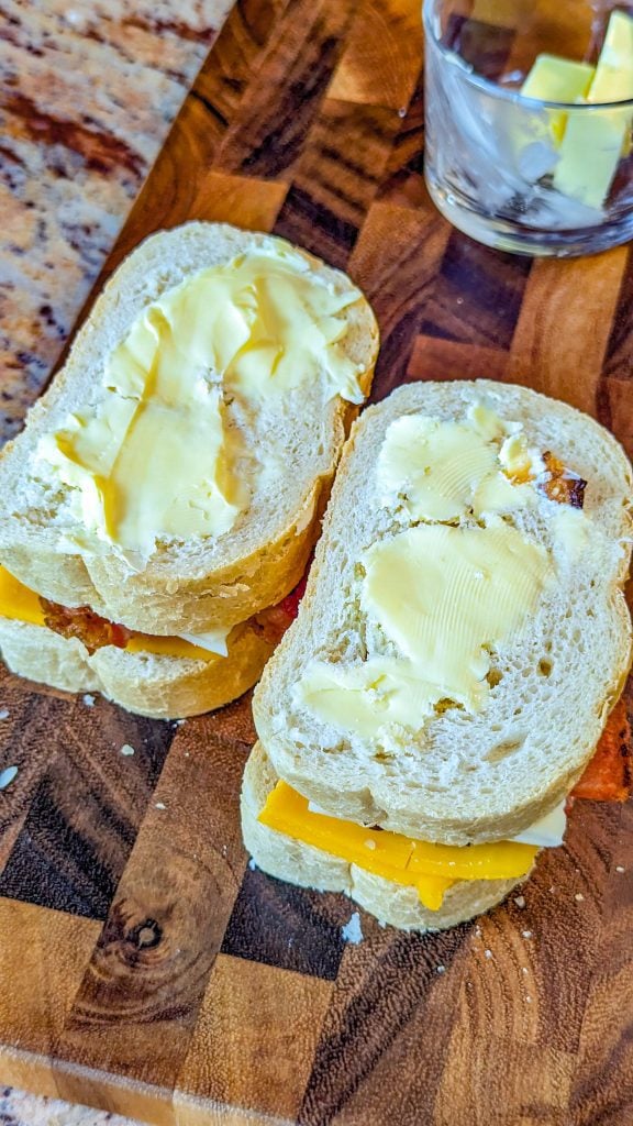 9. Add more butter on top and cook until the bread is golden brown and the cheese is melted.