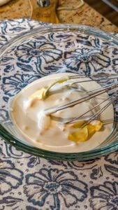 - In a medium bowl, combine the sour cream, mayonnaise, ½ cup of the shredded cheddar cheese, and half of the diced onion. Mix well and set aside.