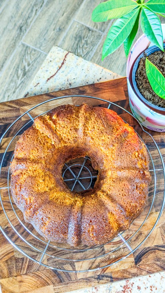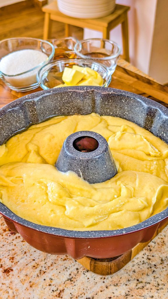 Transfer the Kentucky butter cake batter to the greased bundt pan and bake for an hour. Meanwhile, you can prepare the glaze.