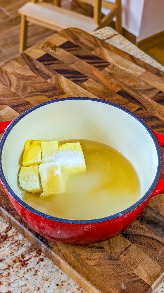 - Add the sugar, vanilla, water, and butter into a pot and cook over low heat while constantly stirring. Once the butter is melted and the sugar is dissolved, remove from the heat.