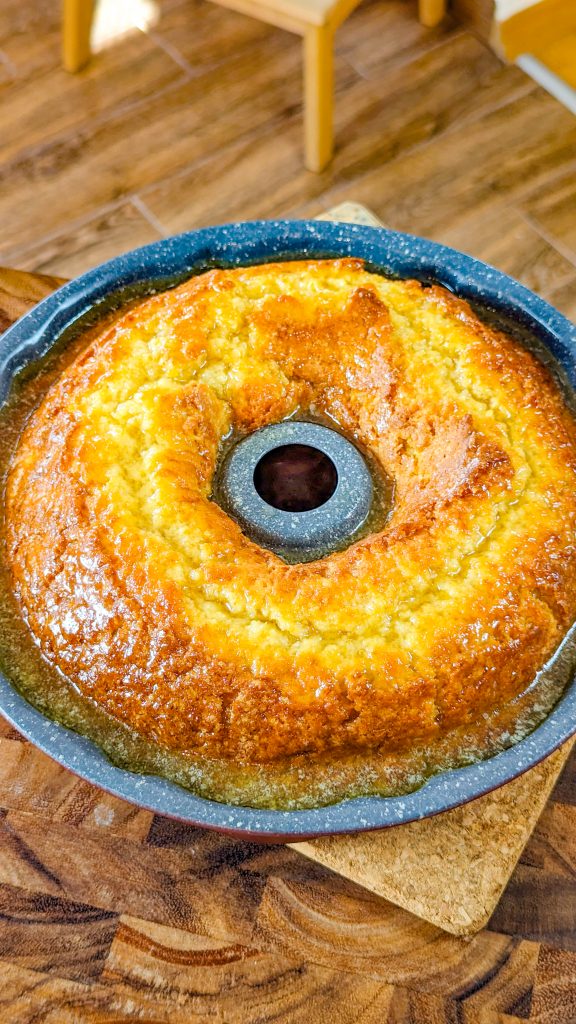 - Remove the cake from the oven and let it cool. Make holes throughout the cake with a skewer and pour the prepared glaze.