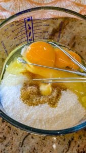 - In a medium bowl, cream together the melted butter and sugar until smooth. Add the eggs and vanilla extract, mixing until fully combined.
