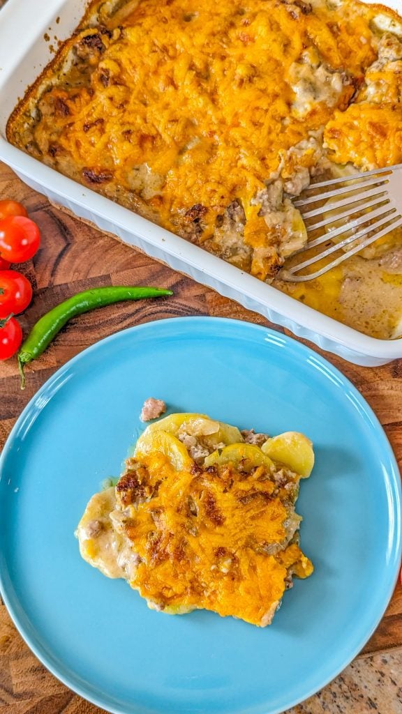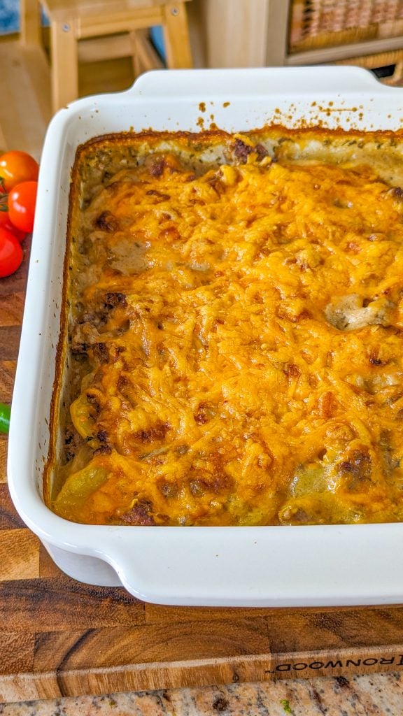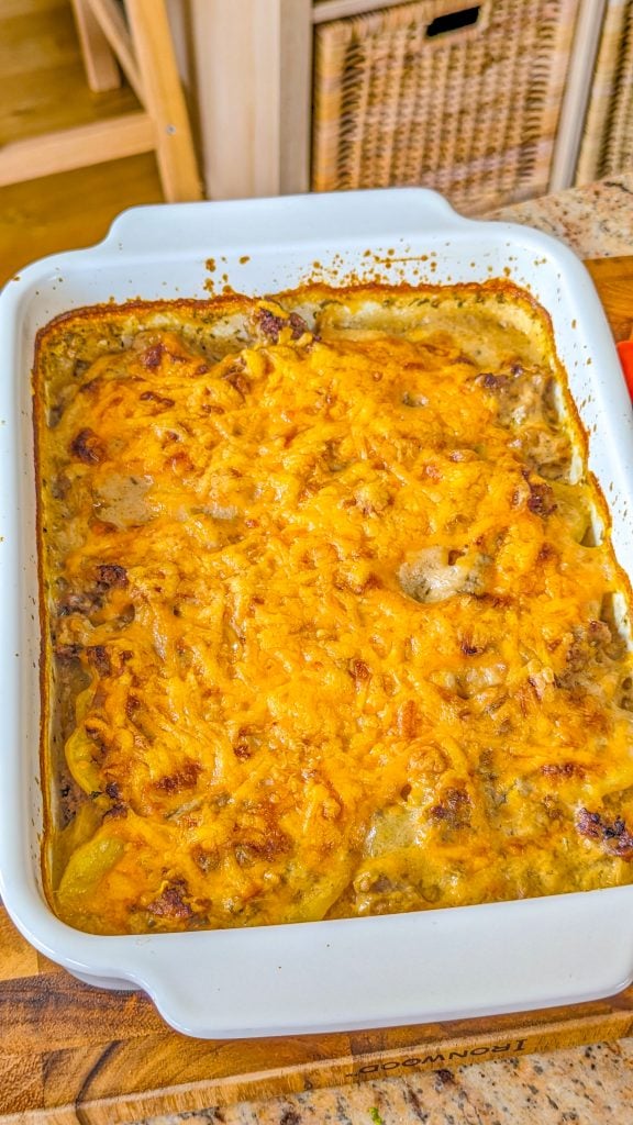 It’s a delicious combination of ground beef, potatoes, onion, broth, mushroom soup, cream, garlic, and cheese, and boasts such a delicious and satisfying taste in every mouthful. And there’s something else in there too, which really elevates the flavor, and that’s rosemary!