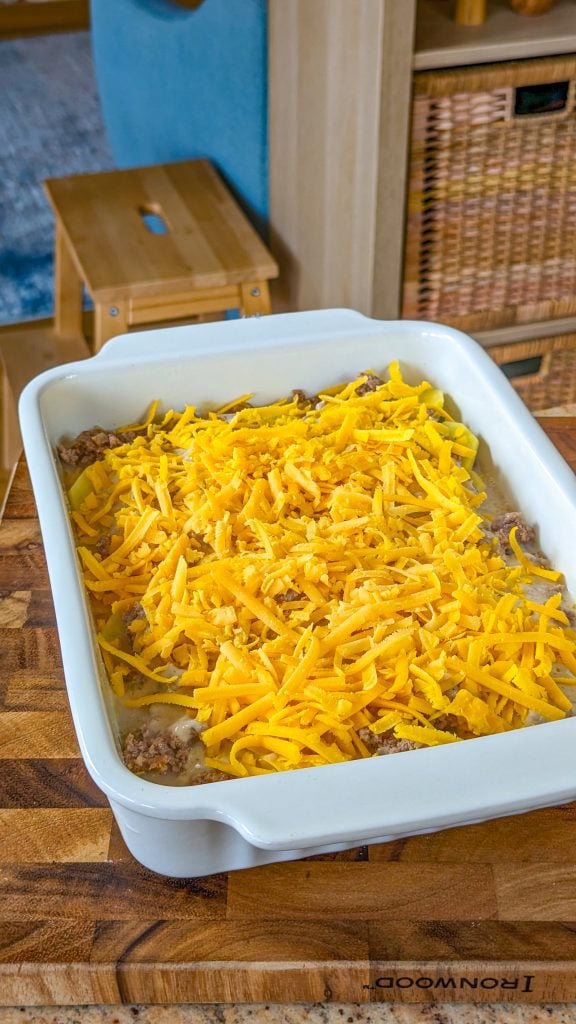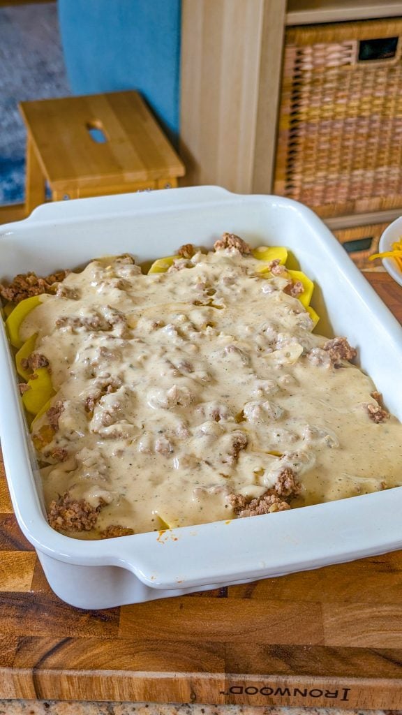 - Now add the rest of the beef mixture, the rest of the soup mixture and the cheese.