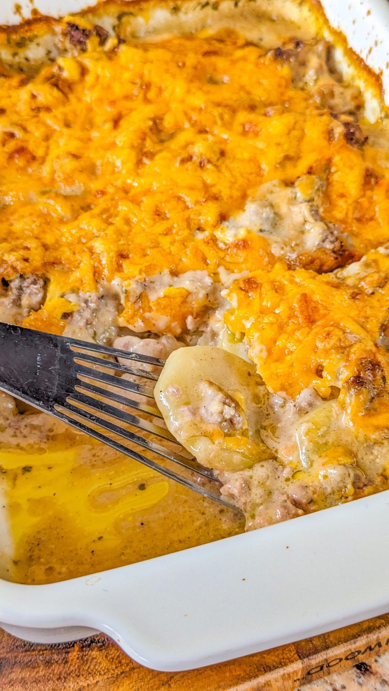 It’s a delicious combination of ground beef, potatoes, onion, broth, mushroom soup, cream, garlic, and cheese, and boasts such a delicious and satisfying taste in every mouthful. And there’s something else in there too, which really elevates the flavor, and that’s rosemary!
