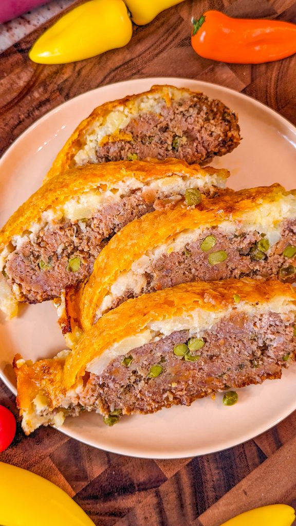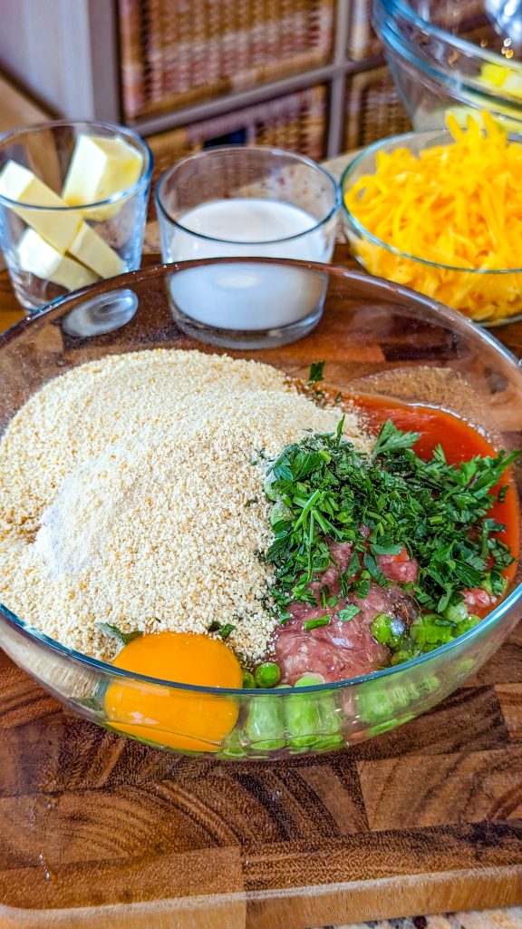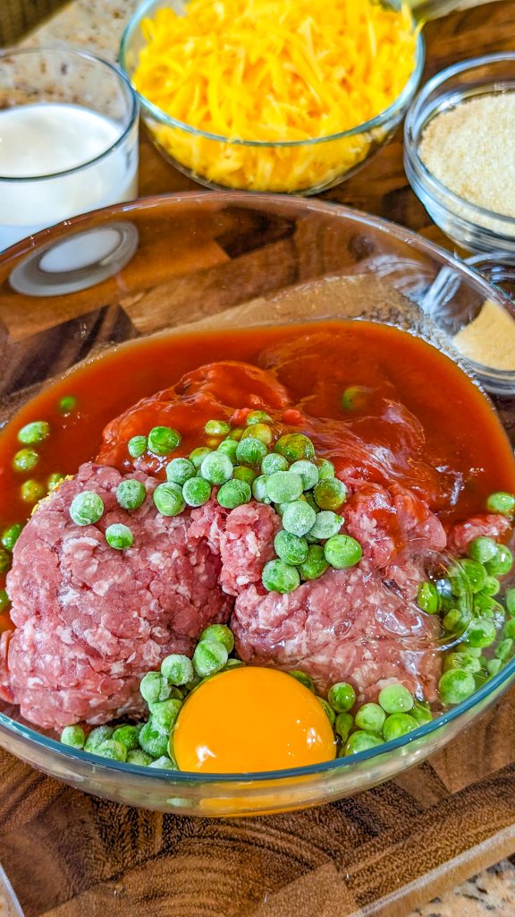 The meatloaf is made with ground beef, garlic, onion, and breadcrumbs, as you would expect from a meatloaf recipe, along with tomato sauce and an egg. And then you have BBQ sauce, peas, and parsley in there too. The mashed potatoes topping has cheese, cream and butter for a rich and satisfying flavor.