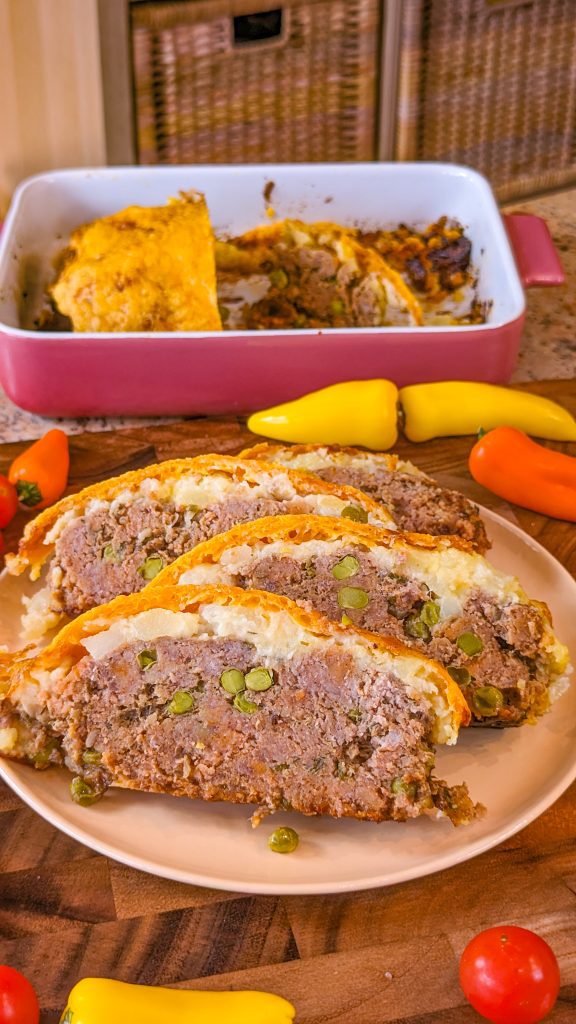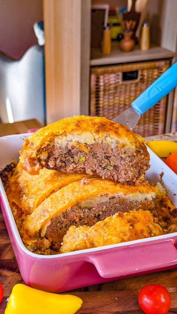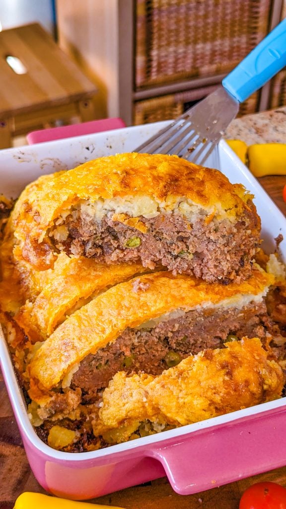 This hearty homestyle comfort food dish is really tasty and the whole family will enjoy it. The meatloaf itself is full of flavor and the mashed potato topping is the jewel in the culinary crown.