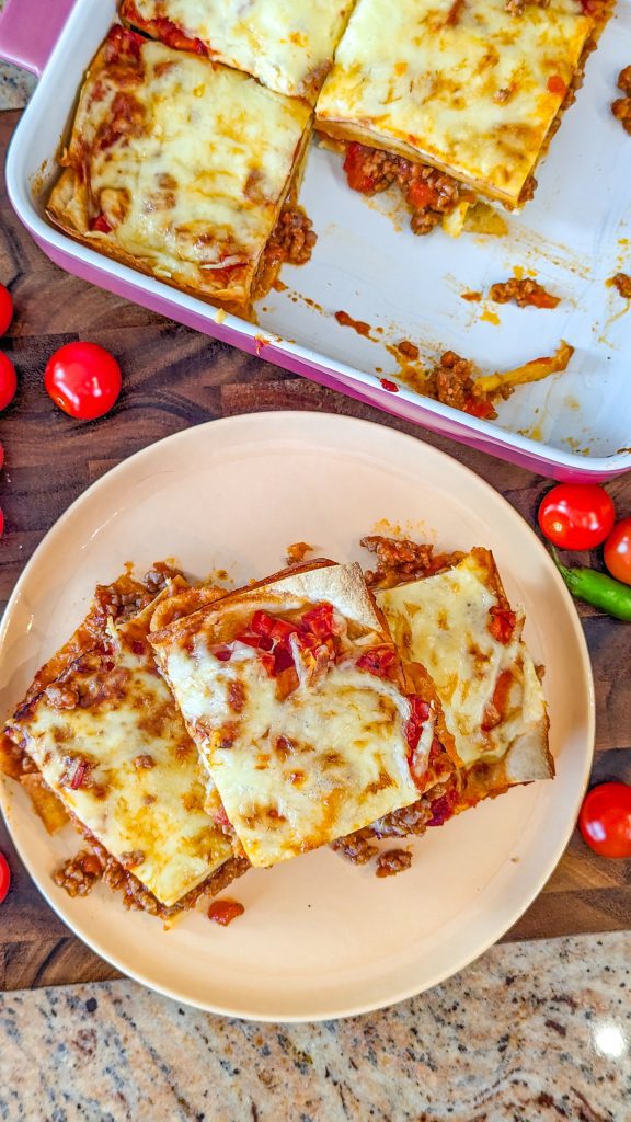 Lasagna is a beloved Italian dish with meat, tomatoes, cheese, and Italian flavors, while tacos have tortillas in place of lasagna noodles and are flavored using different spices. This dish is different though, because it’s a flavorful combination of Mexican flavors and an Italian cooking technique.