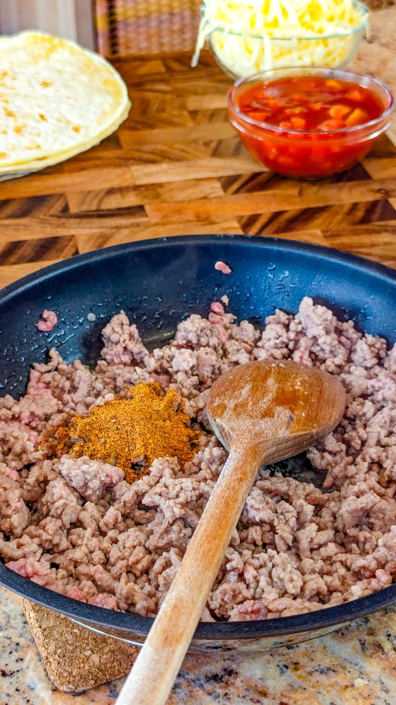 3. When the beef is brown all over, stir in the tomatoes and taco seasoning.