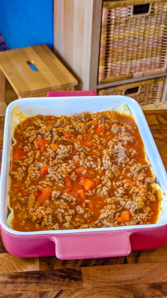 5. Spoon the meat mixture on top and then add the rest of the tortillas.