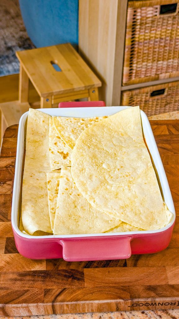 4. Arrange half the tortillas over the bottom of a 13 x 9-inch baking dish so they overlap.