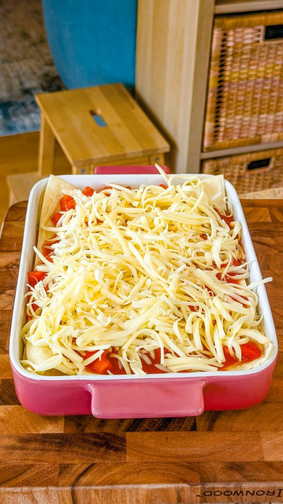 6. Spread salsa over the top and sprinkle over the cheese.