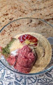 - In a large mixing bowl, add the ground beef, chopped onion, chopped bell pepper, Worcestershire sauce, parsley, Dijon mustard, barbecue sauce, bread crumbs, Italian seasoning, garlic powder, egg, salt, and black pepper.
