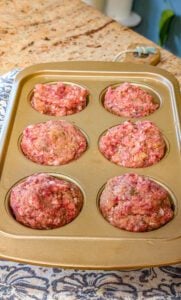 - Divide the meat mixture evenly into 10 portions and place each portion into a muffin cup. Press the mixture down slightly so each muffin holds its shape and fills the cup evenly.