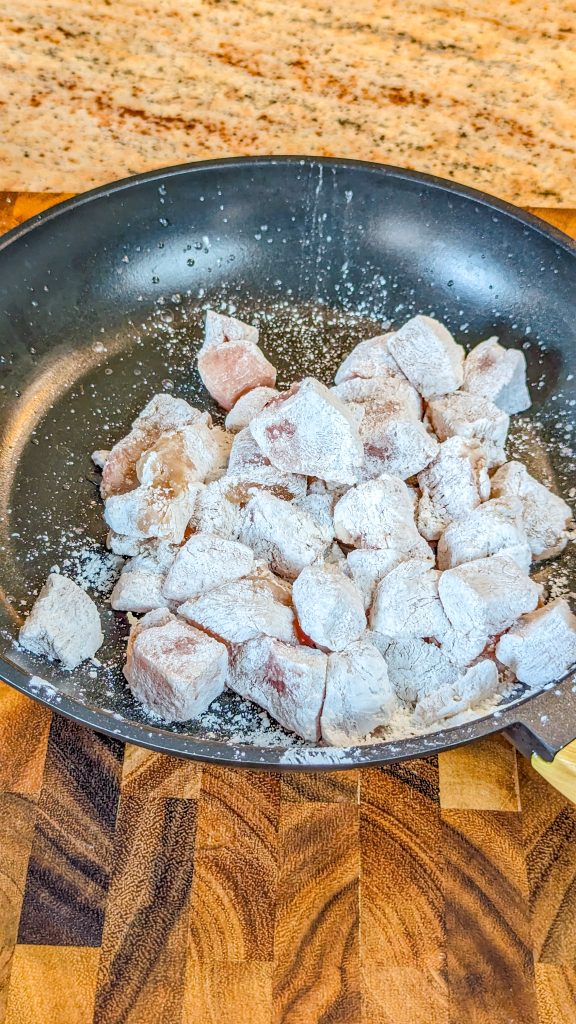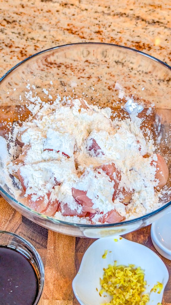 - Put the chicken in a large Ziploc bag with the cornstarch and shake to coat.